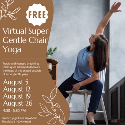 Join this Chair Yoga class, led by KC Knudsen, from the comfort of your own living space. First-time virtual participants will need to register below to receive the Zoom program link $5 donations are requested.