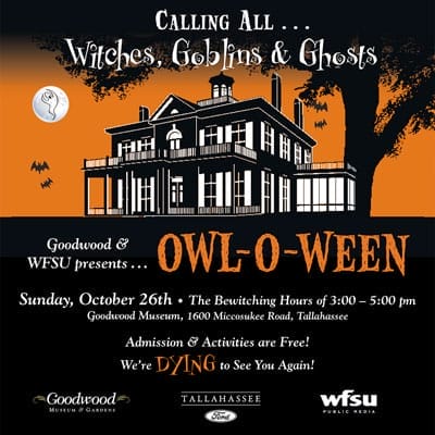 Goodwood Museum & Gardens, WFSU, and Tallahassee Ford are joining forces to present “Owl-O-Ween: A Family Fun Day at Goodwood”.